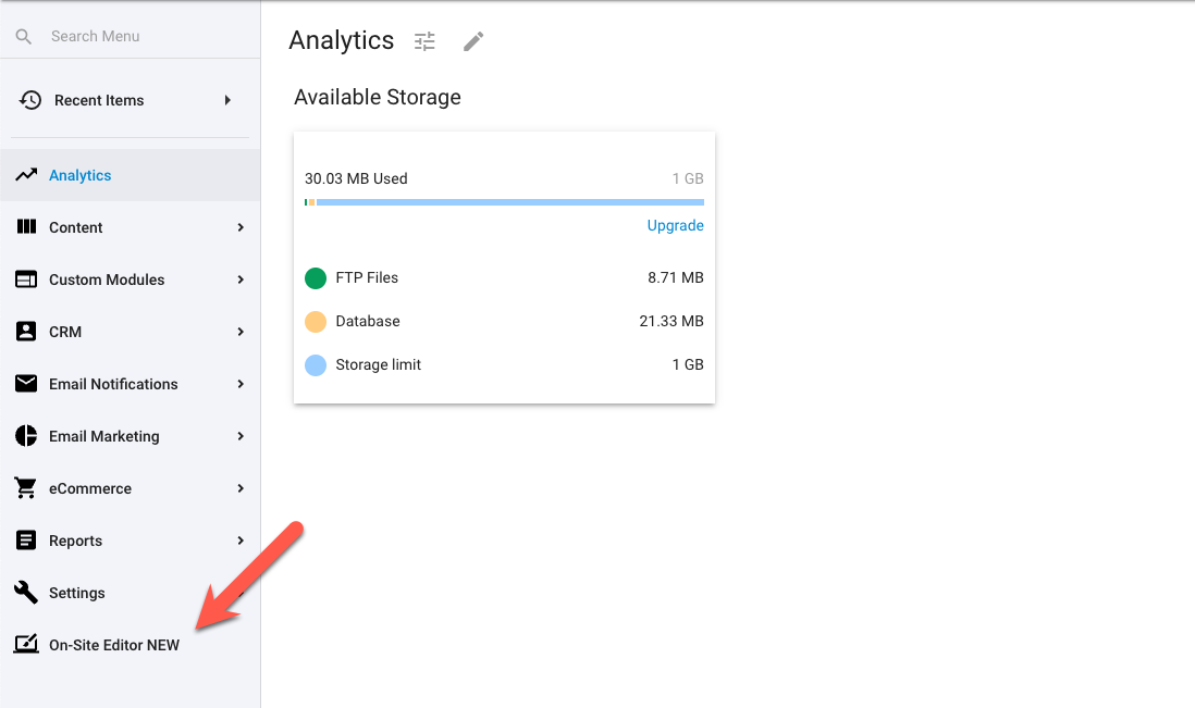 When in the On-Site Editor mode, the editing sidebar will display to the left of your website.