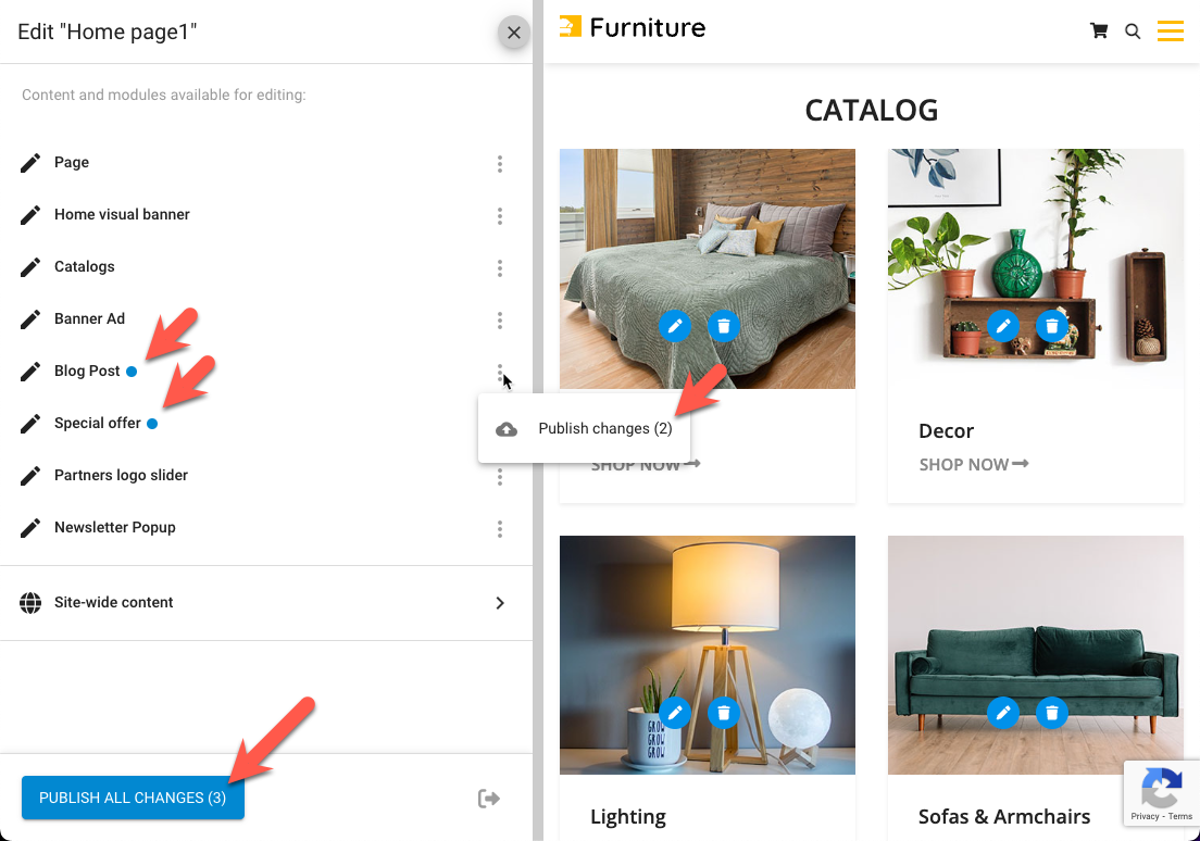 Clicking the listed module name’s 3 dot () contextual menu will display an option to publish any draft changes that have been made, along with a number of item’s, for that module, that will be published with this action.