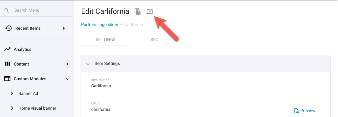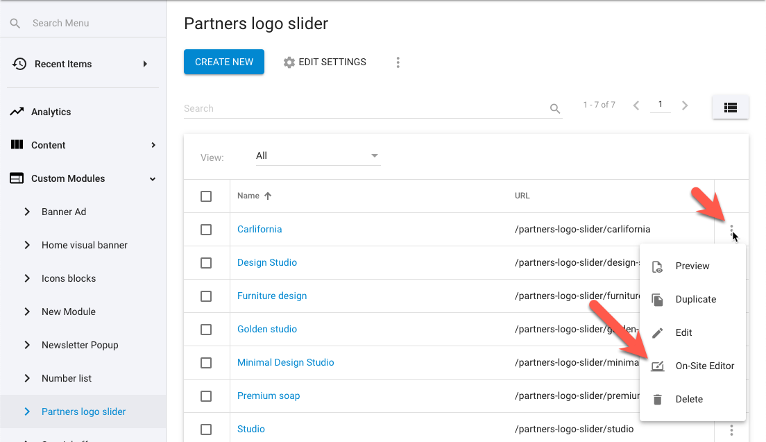 Additionally, module items will provide On-Site Editor links, to their detail pages, both from the 3 dot () contextual menu in the module list view: