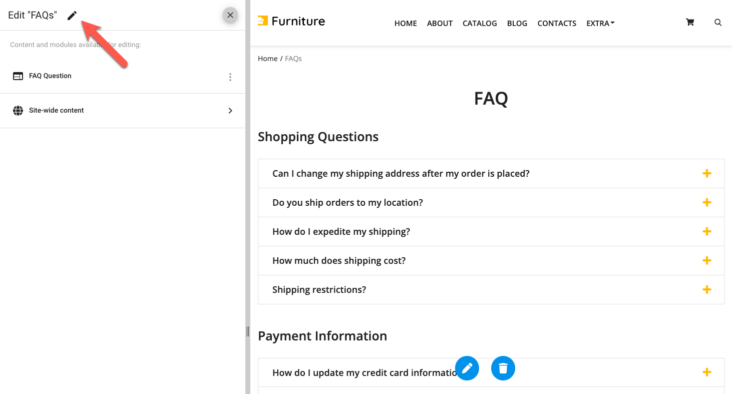 Any detected module wrappers on the current page will be listed in the sidebar and clicking on a listed module name will scroll to that module’s content on the page so that you can easily and quickly access its edit buttons.