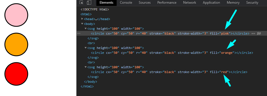 In the browser we see that the first two have their colour set with the fillColour custom parameter, and the third insertion falls-back to red, the default colour.